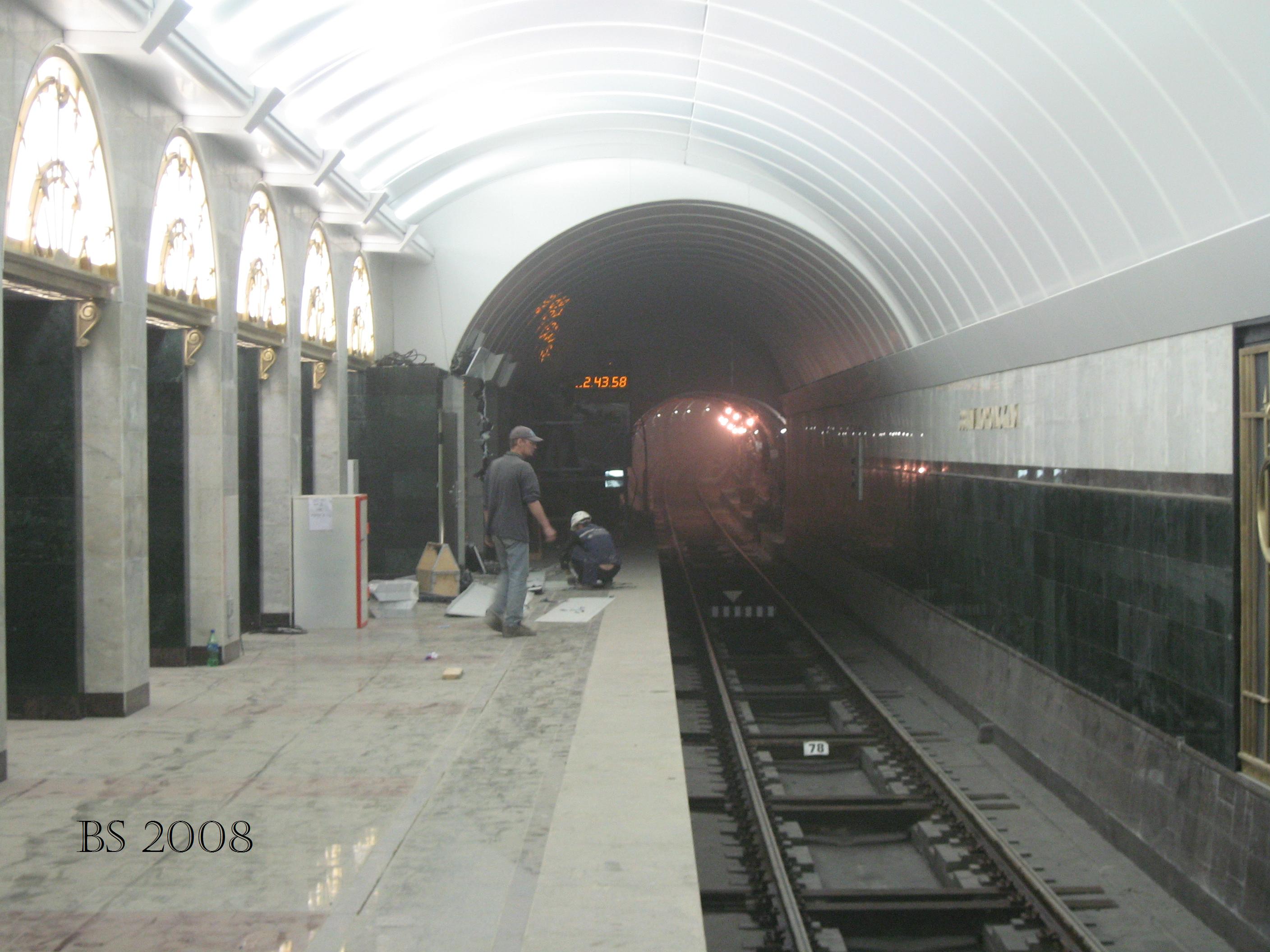 На станции полностью заменено освещение. Теперь это не точечные прожекторы как было, а линейные светильники как в реконструированных НХ, причём везде одинаковые: и в боковых залах и в ЦЗ и в арках. Освещённость на 4-. Не самое удачное решение.