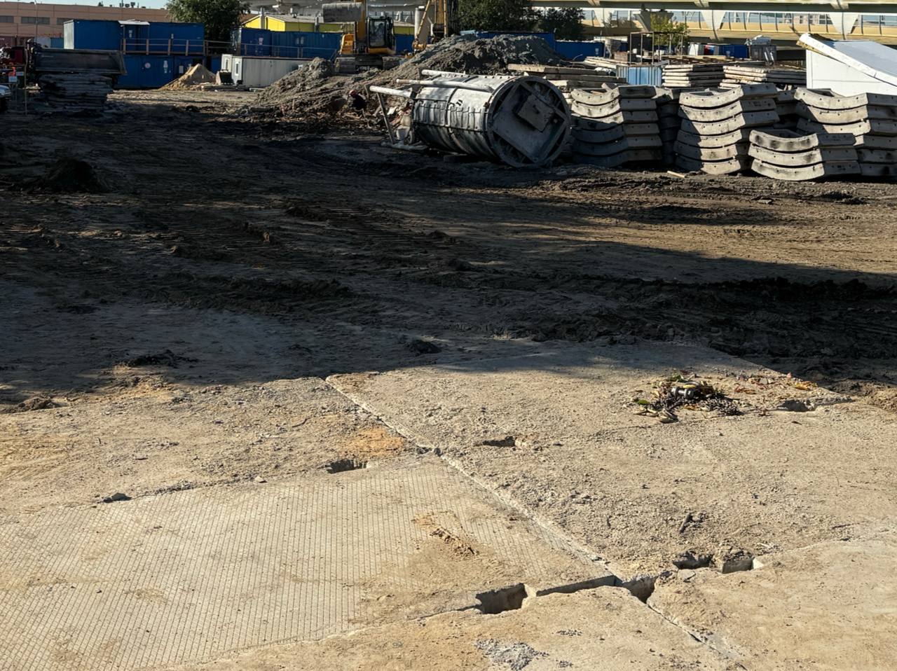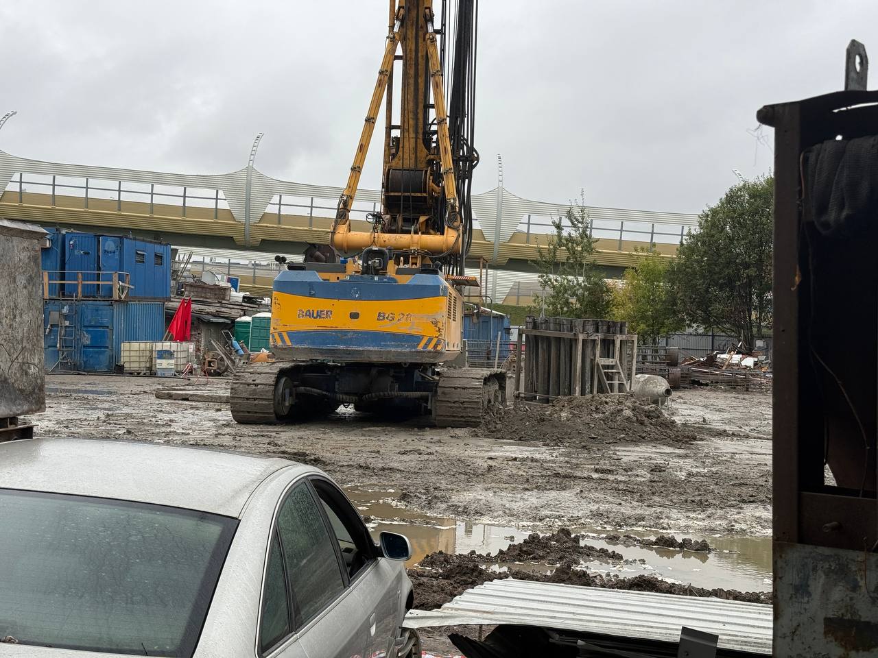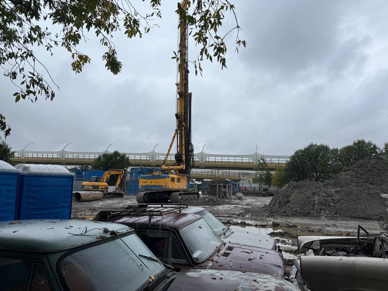 На площадке идет бурение буросекущих свай. Они будут выполнять роль ограждения для установки будущих бетонных блоков - контура шахты.