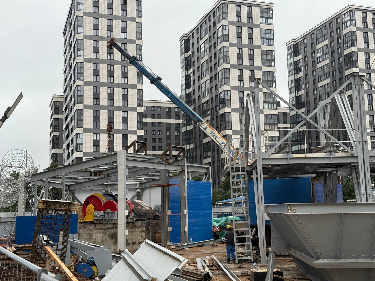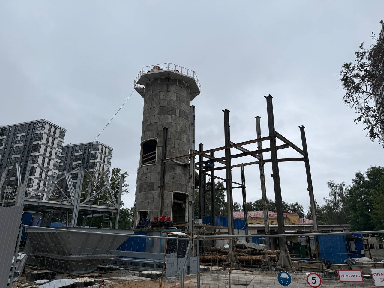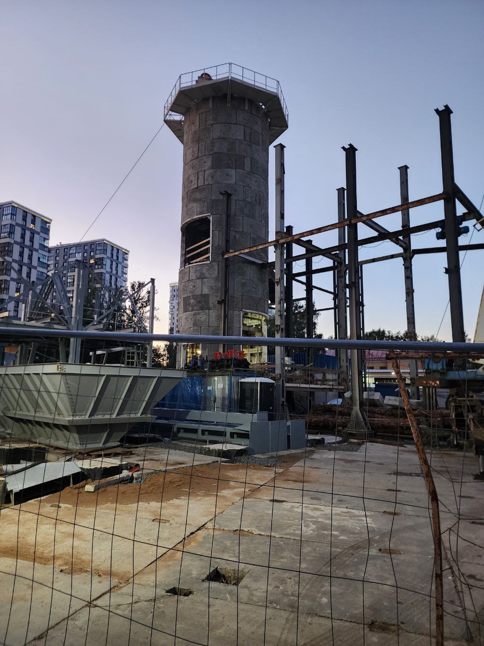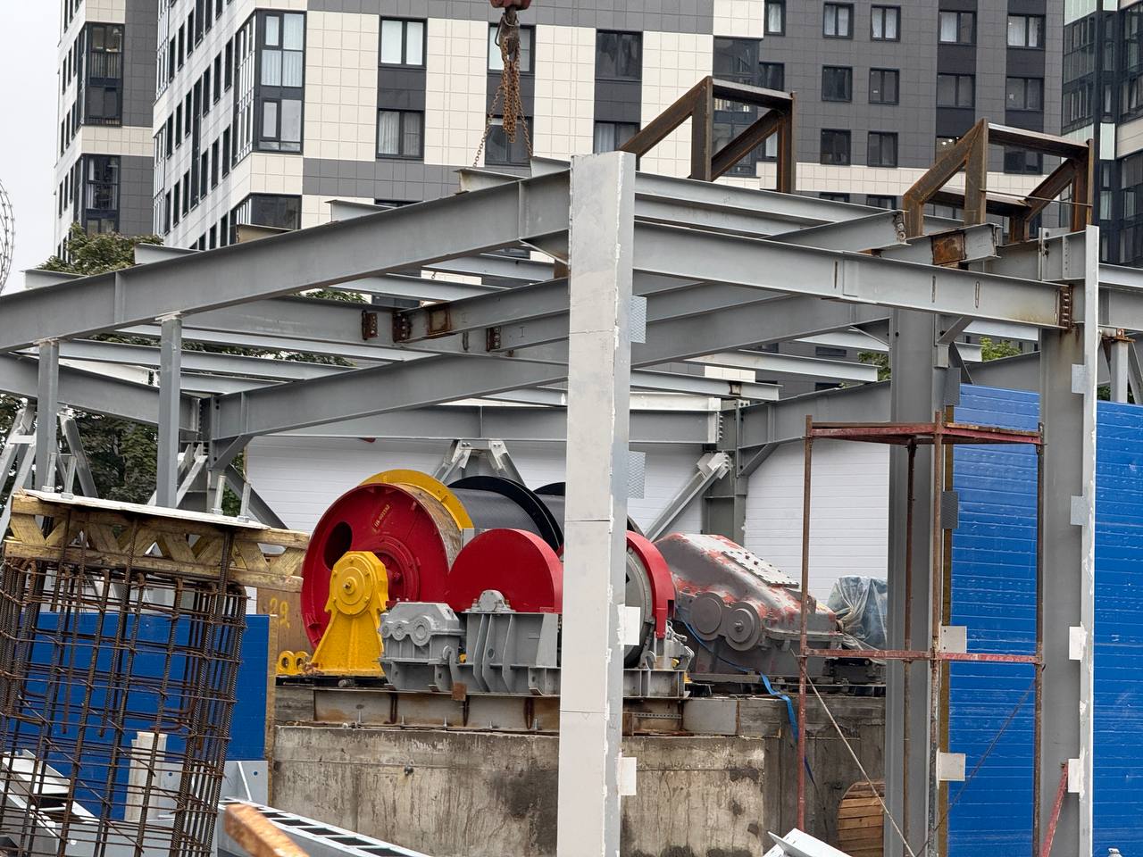 Здесь продолжается устройство здания горного комплекса. Предположительно оно должно быть готово уже к концу осени 2025 года. На площадке уже установлен подъёмный механизм клети.