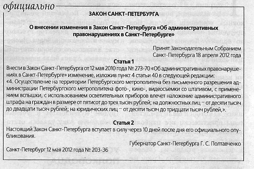 В газете "Петербургский дневник" (еженедельное издание Правительства Санкт-Петербурга) №20 (386) от 24 мая 2012 года официально опубликованы изменения в Закон "Об административных правонарушениях в Санкт-Петербурге", касающиеся ограничений на фото-, кино-, видеосъёмки.