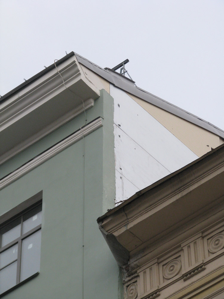 судба странного карниза (левая часть карниза на угловом фасаде отличается от правой не лучшим образом) не ясна, на нём нет профилей и он не окрашен, может его демонтируют?