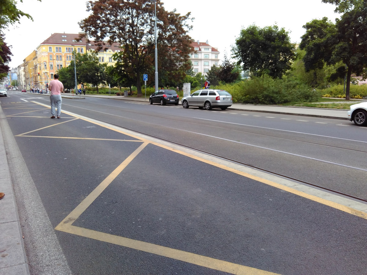 Посадочные площадки обязательно нужны, а если их сделать никак нельзя, то можно сделать, например, вот так, как здесь (Прага) - проезжая часть в зоне остановки приподнята до уровня пола трамвая, получается и этакий ЛП, стимулирующий снижать скорость, и одновременно безбарьерная остановка для удобной посадки и высадки