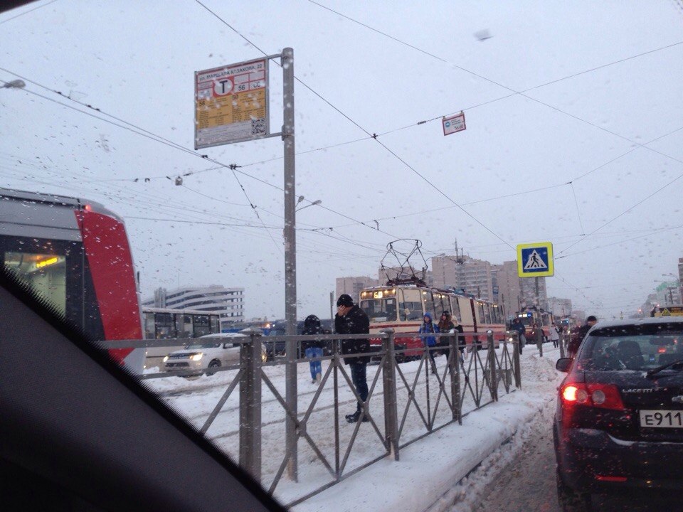Сегодня застревали не только автобусы. Альстом из-за нестандартных бортов также сегодня отличился на Казакова напротив Окея в сторону Юноны откапывается трамвай. Было в 16-40.