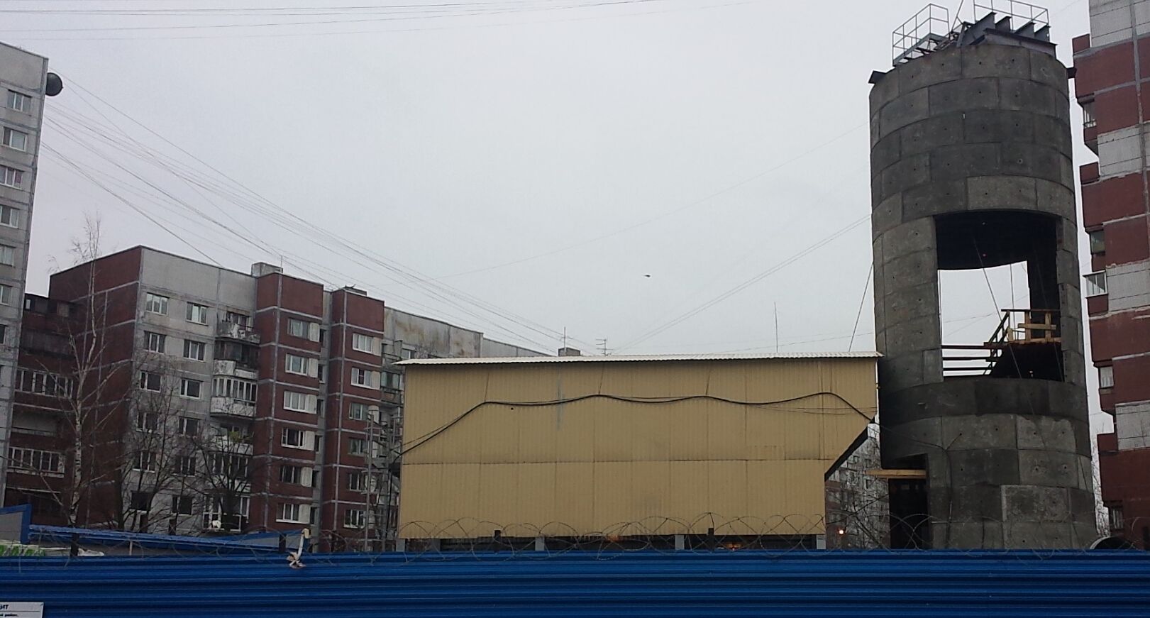 Это обшивка временной эстакады (для выдачи бадьи при проходке ствола). После окончания проходки ствола её разберут и вокруг ствола будут смонтированы постоянные технологические эстакады (бункерные, тельферные).