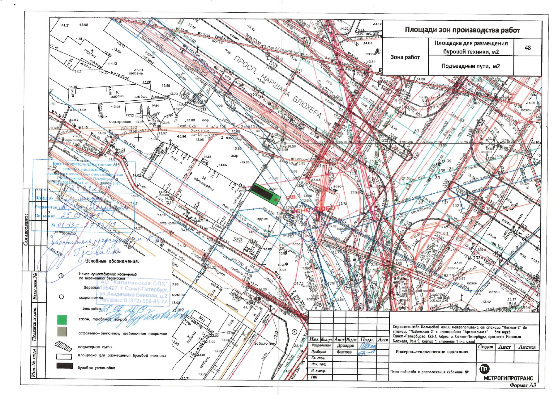 Бурение скважин будет проводиться силами АО «Метрогипротранс» на объектах строительства участка Красносельско-Калининской линии метрополитена от станции «Казаковская» до станции «Сосновая Поляна» по адресу ул. Маршала Казакова, д. 58, а также Кольцевой линии метрополитена от станции «Лесная-2» до станции «Ладожская-2» по адресу пр. Маршала Блюхера, д. 9, корп. 1.