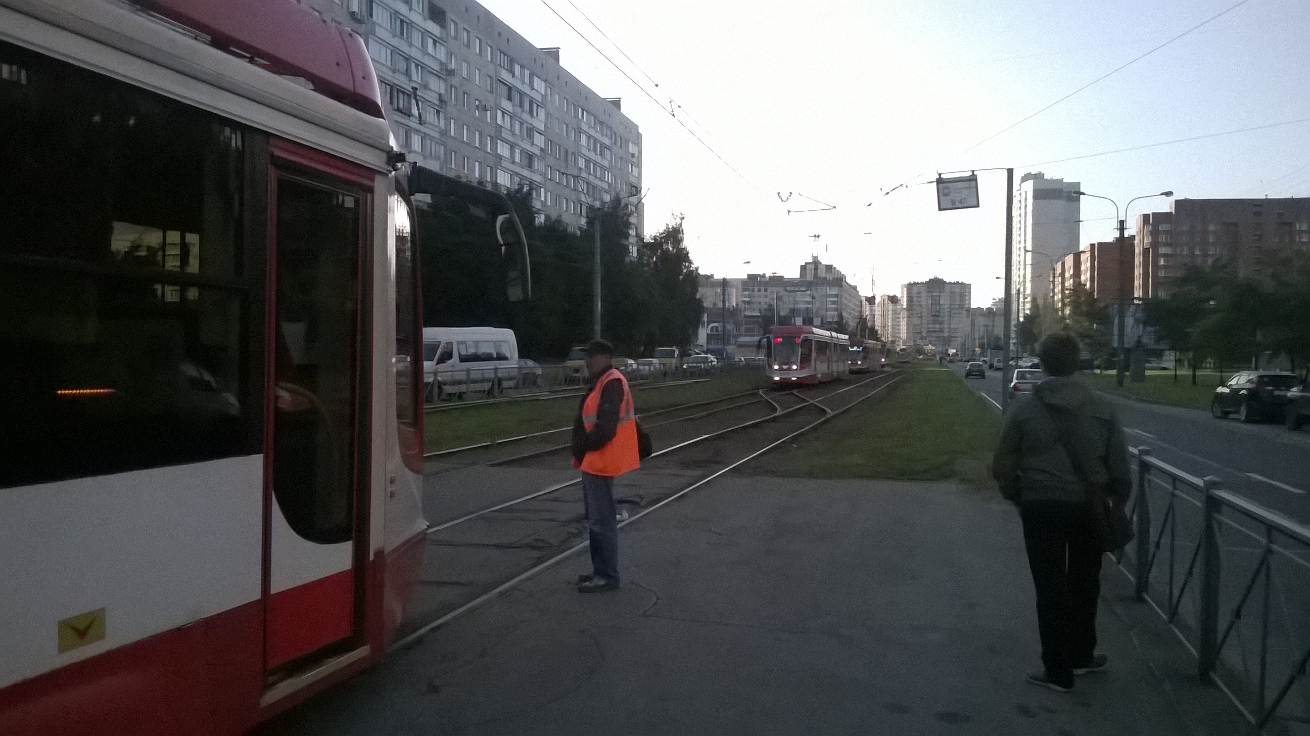 При прибытии трамвая на конечную остановку пассажиров выпускают в междупутье, открывая двери с правой стороны по ходу. Там междупутье заасфальтировано, поэтому это удобно и безопасно для пассажиров. Когда водитель переходит в противоположную кабину, он открывает двери со стороны штатной посадочной площадки (опять справа по ходу) и впускает пассажиров. Сегодня вечером очереди из трамваев, ожидающих разворота, не было, вопреки моим ожиданиям по увиденному утром. Будем надеяться, что так будет и дальше, пока идет ремонт.