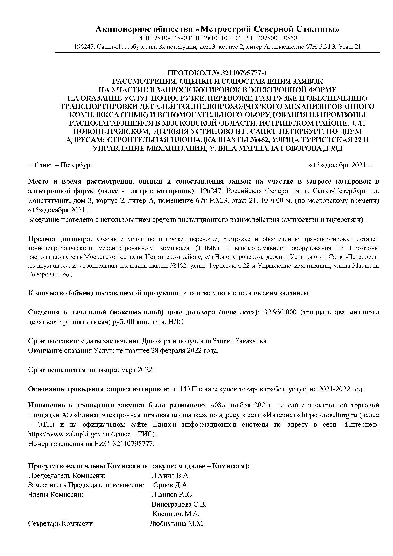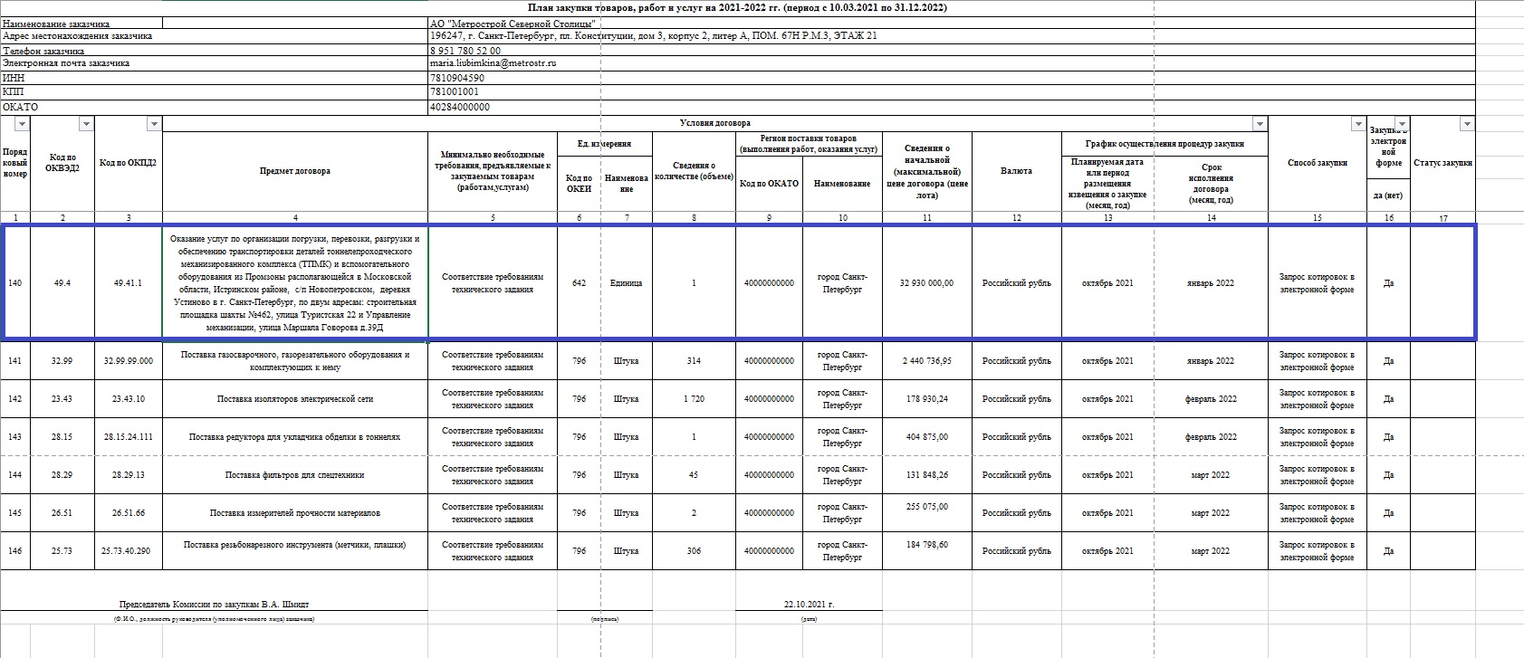 Работы по транспортировке ТПМК Herrenknecht S-782 из Мск в СПб в плане закупок АО "Метрострой Северной Столицы":