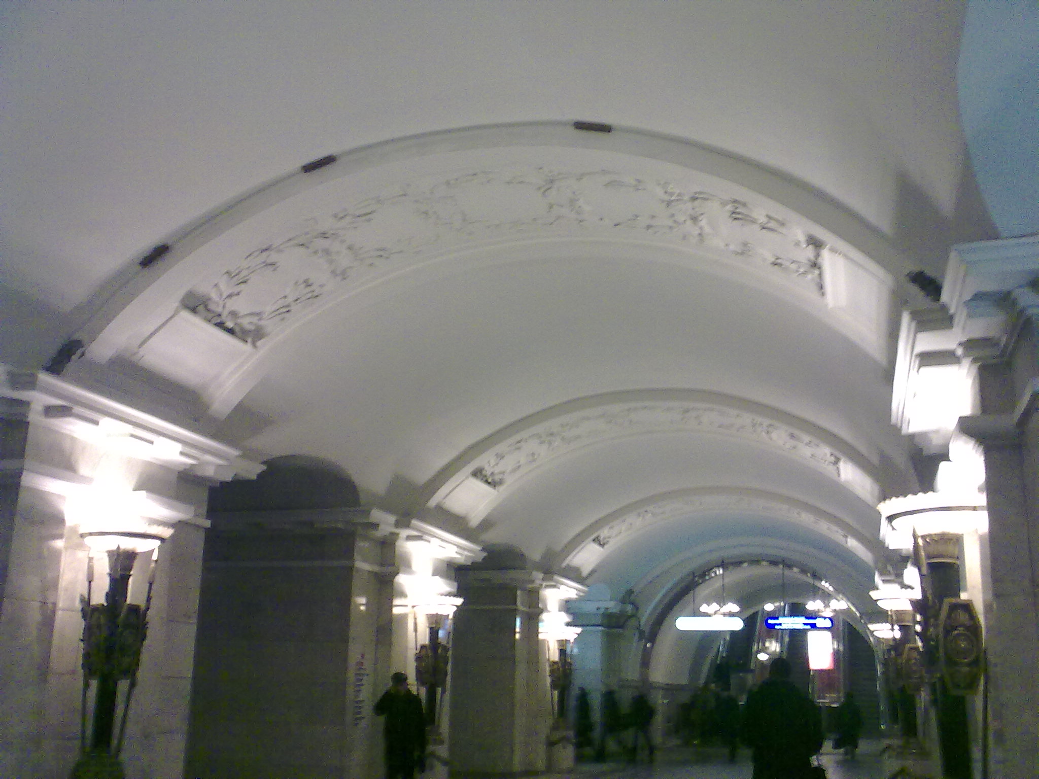 На путевой стене в сторону "Технологического института" - одно название станции литыми буквами, на стене в сторону "Владимирской" - три. Под всеми ними расположились "простыни". Очень похоже, что на "Пушкинской" в ЦЗ лайтбоксы будут расположены на дугах, а не на стенах, как на "Владимирской". По крайней мере, в трёх местах в ЦЗ на потолке замечены насверленные отверстия, а около одного из этих мест уже подведён кабель.