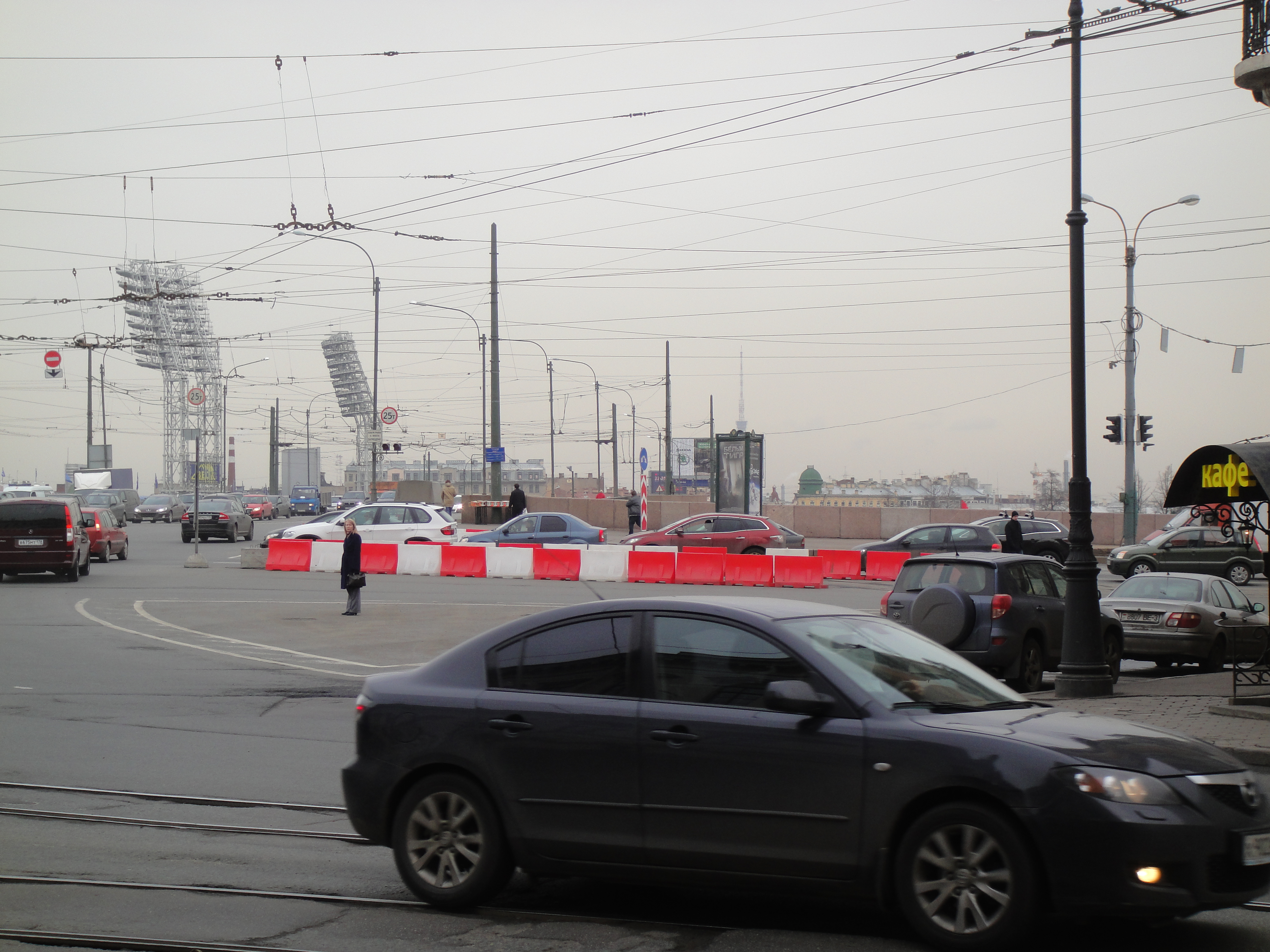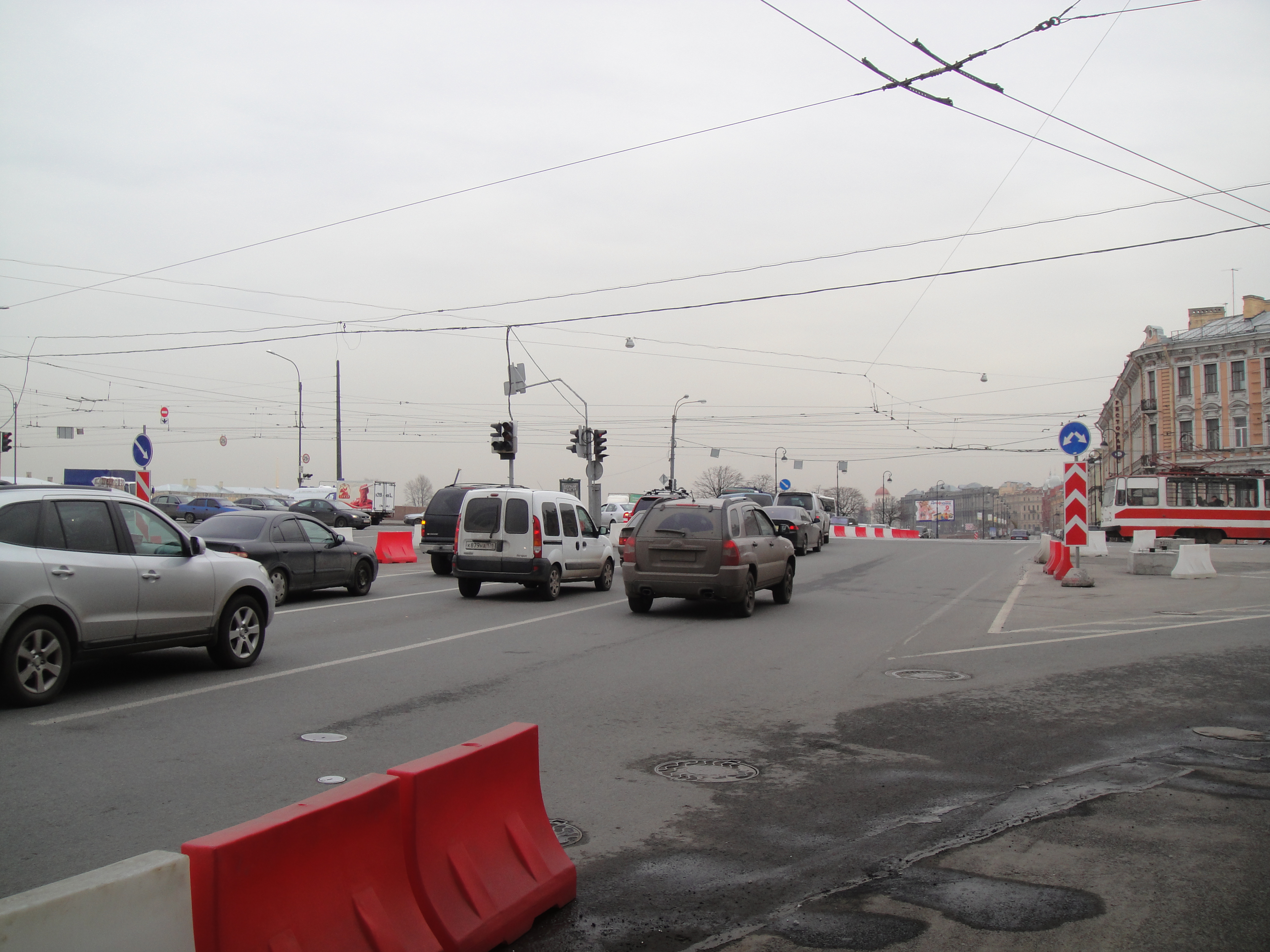 На перекрестке схема движения соответствует ранее опубликованной. Сегодня ночью была перенесена на временные опоры контактная сеть троллейбуса, но 9-ка еще ходит по Большому проспекту.