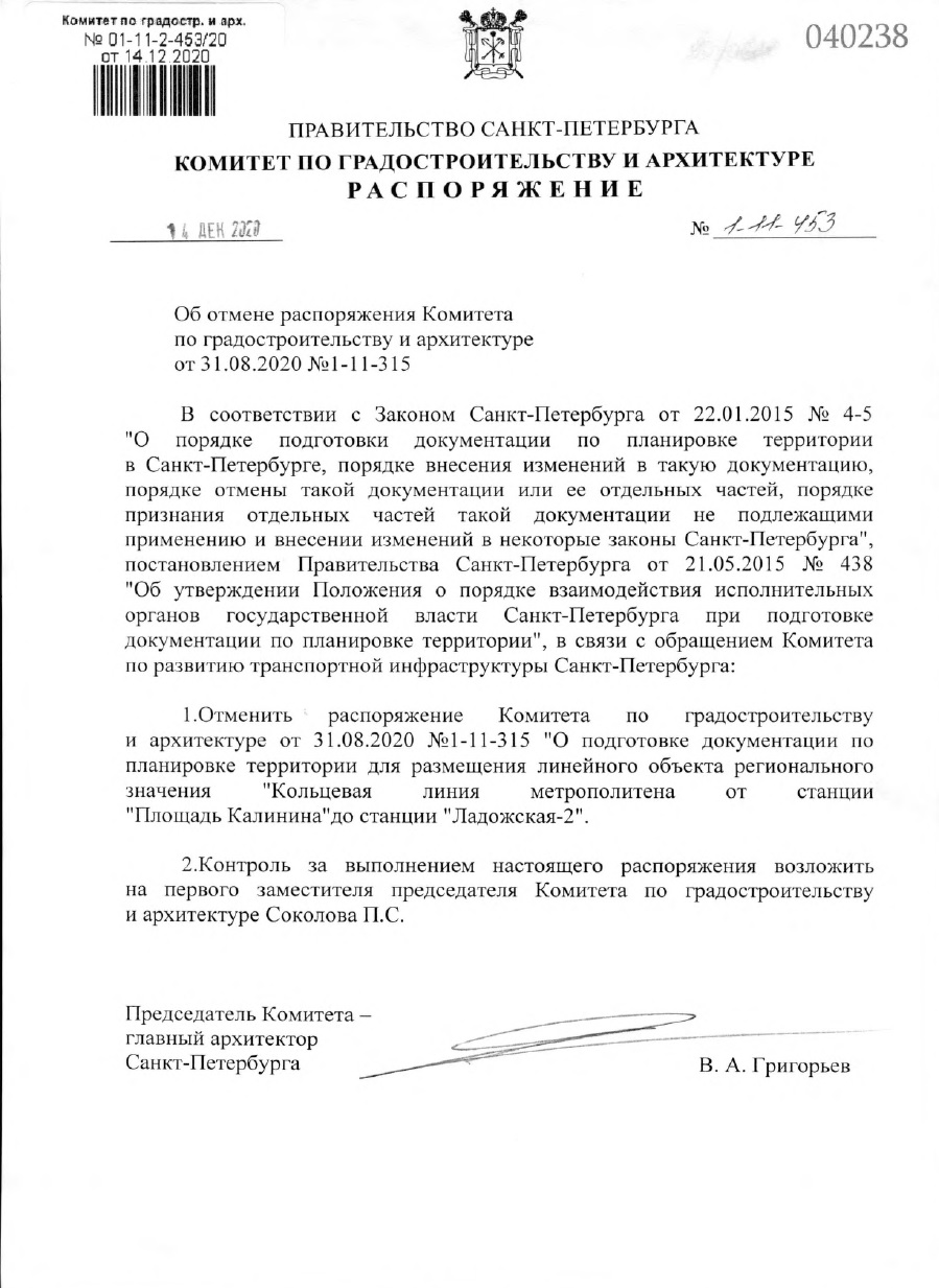 Отменено Распоряжение КГА от 31.08.2020 № 1-11-315 "О подготовке документации по планировке территории для размещения линейного объекта регионального значения "Кольцевая линия метрополитена от станции "Площадь Калинина" до станции "Ладожская-2".