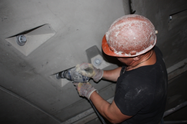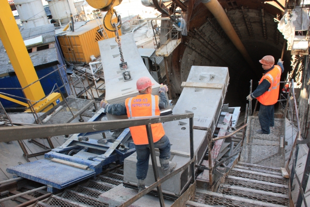 "Спасская" на 20 метров ближе к поверхности, чем "Адмиралтейская", длина наклонного тоннеля - 88 колец, то есть примерно столько же метров. Каждое кольцо состоит из восьми железобетонных секций. Каждая секция весит от трех до пяти тонн. Кран загружает очередной блок в тоннель, а "Аврора" облицовывает этими блоками стены, как туалет - кафельной плиткой. Осталось 8 колец.