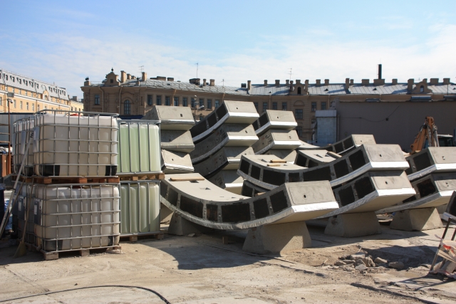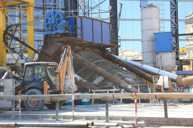 С прошлой осени добрая треть Сенной площади огорожена синим забором. Внутри – загадочные железобетонные конструкции, громадный желтый кран – так называемый козловой – и черная пропасть: спуск в тоннель длиной 88 метров. Из-за строительного вагончика выглядывает заспанный человек и вежливо приветствует журналистов по-немецки.
