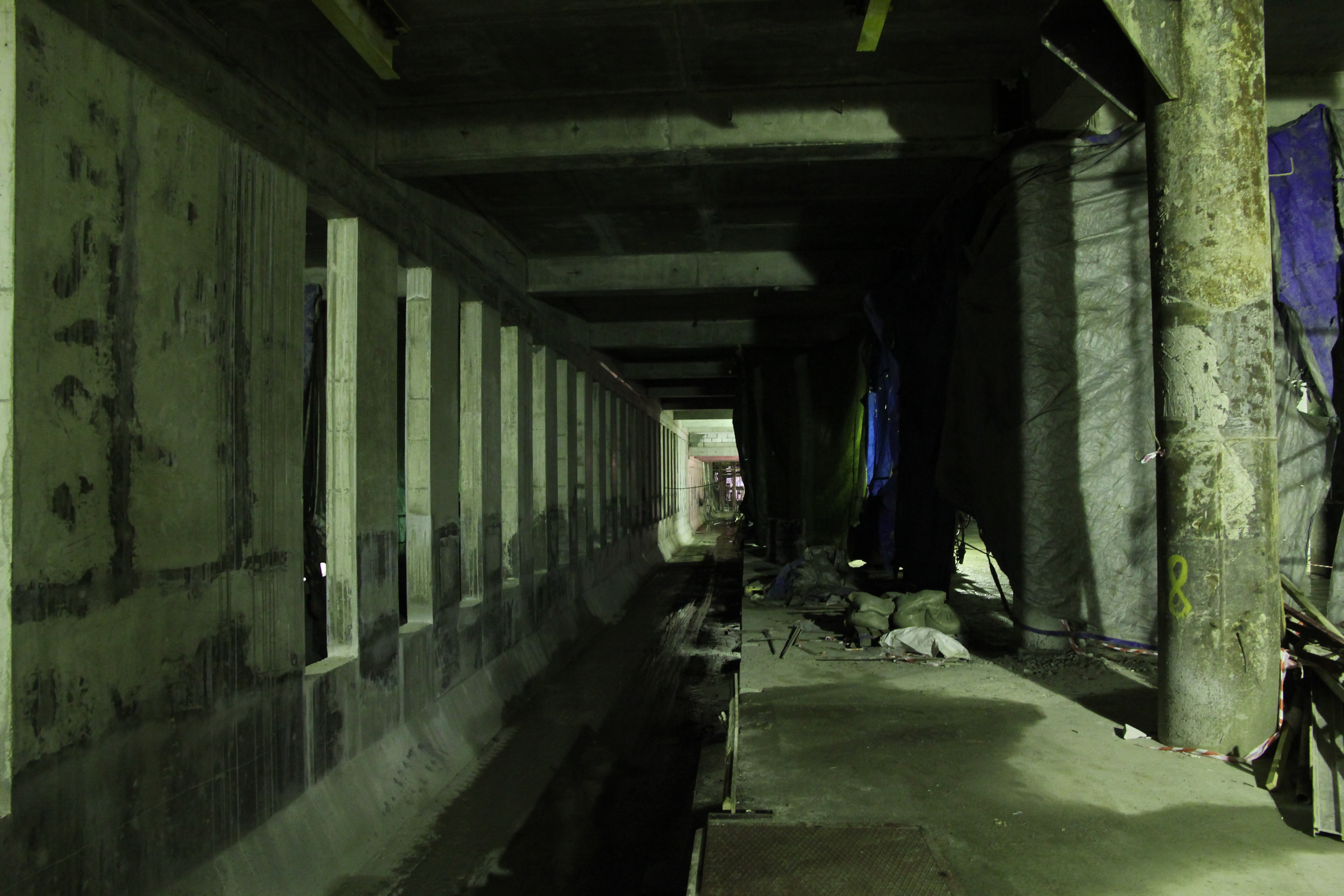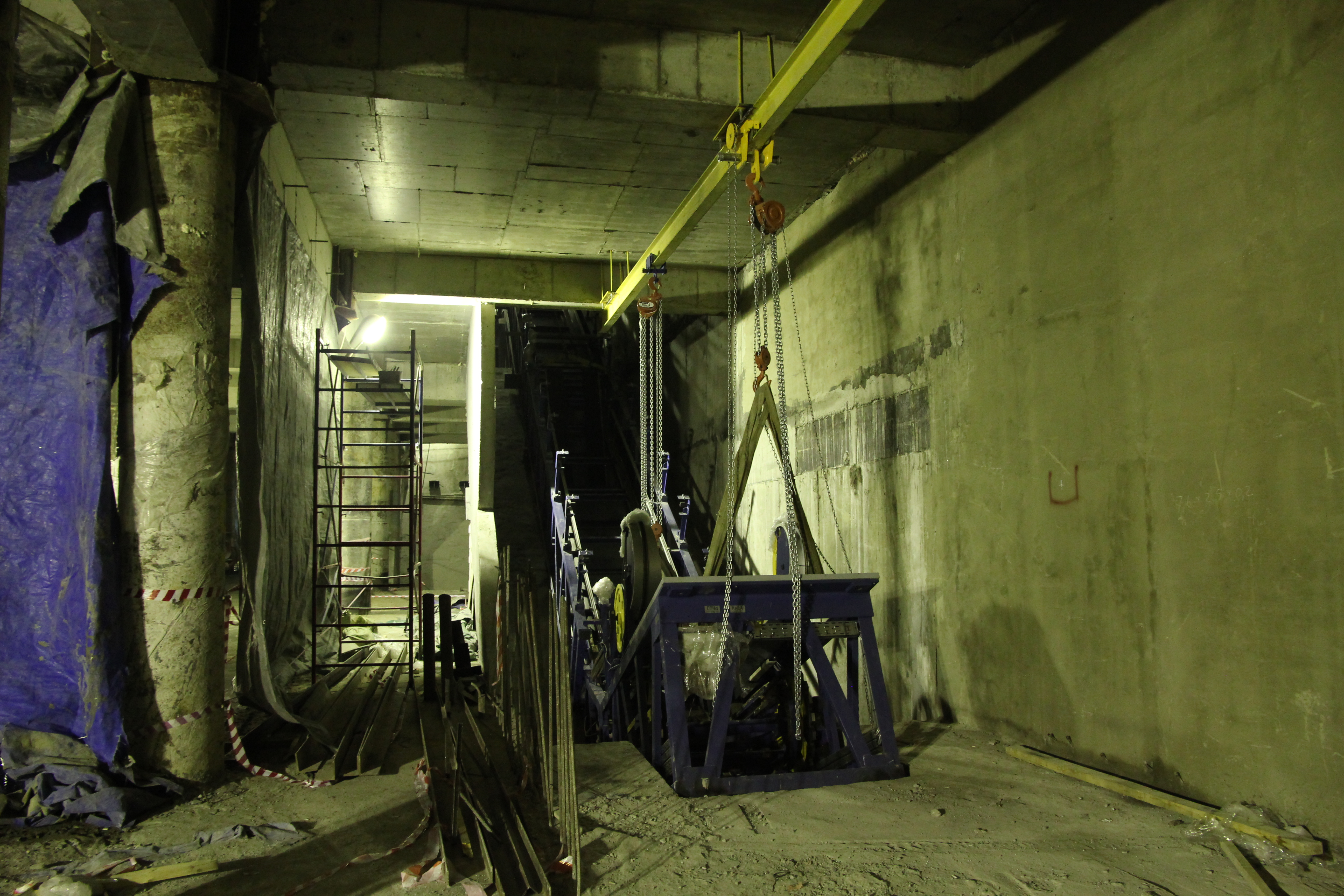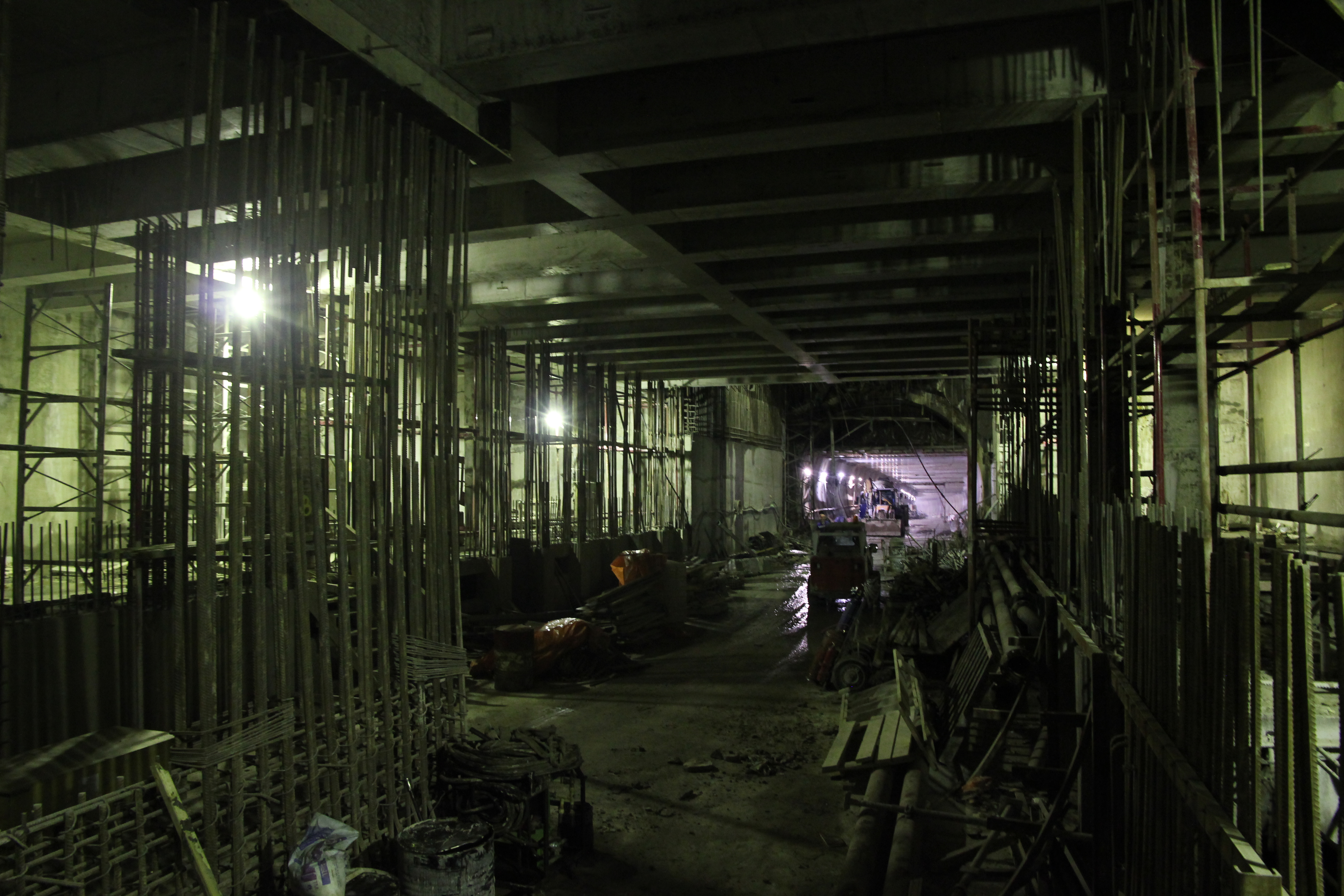 Итак на верхнем ярусе в вестибюле продолжается укладка гранита. Бетонируются технологические проемы в перекрытиях. Нас среднем ярусе ведутся работы по монтажу перегородок служебных помещений и бетонированию перекрытия на отметке +6,40 в центральном пролете (у южного торца). В районе переходного мостика ведется подготовка к отделочным работам. На платформе тоже самое, ведется подготовка к укладке гранита и укладка гранита. От 22 оси до 36 оси (южного торца), там где было отставание из-за гидроизоляции, ведется армирование платформы, стен и других внутренних конструкций.