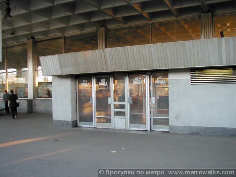 С другой стороны вестибюля, было "банное" остекление (подобное было еще на станции "Купчино") - толстые стекла-"квадратики". Сейчас остекление заменено на тонированоое стекло. Сам фасад, при этом, не реставрировали.
