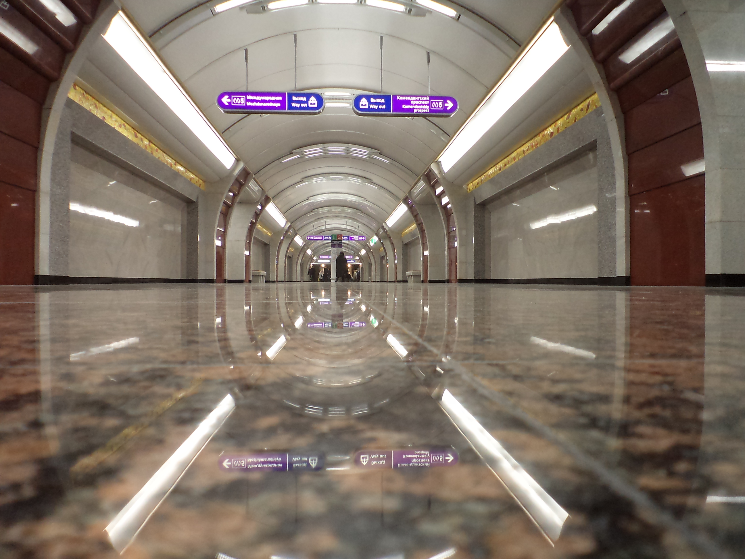 Панно в торце зала, очень удачный цвет камня, которым "ступенчато" облицованы пилоны, интересная облицовка дверей на путевых стенах, а также светильники в ЦЗ, сгруппированные почти как на "Кировском Заводе". Еще очень понравилось, что проходов между пилонами больше, чем на "Обводном Канале": явно нацеливались на большой пассажиропоток (которого пока что нет). Ну и довольно яркое освещение. А также "аэрокосмические", отличные от привычных, объемы центрального зала, уже однажды опробованные на "Обводном Канале" - беспроигрышный вариант для пилонника XXI века. А, еще дежурная по станции понравилась :crazy:
