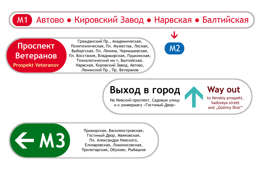 Стрелку на пиктограмму заменить небольшая проблема. Здесь вместо неё — цветовое кодирование. (Указатели выхода в город и основных объектов на поверхности должны немного отличаться от указателей по самому метрополитену.) Номер линии нужен, например, для указателя перехода. Кроме того, он указан в списке станций на путевой стене (опять же, указатели связаны цветом). Не вижу большого смысла дублировать эту информацию на лайтбоксах, висящих непосредственно на платформах.