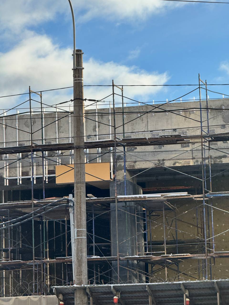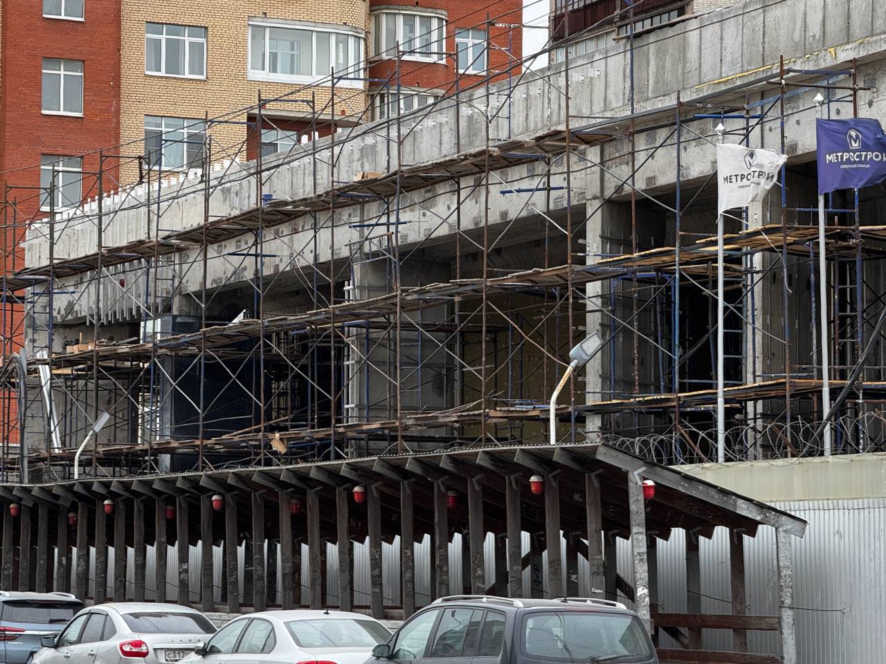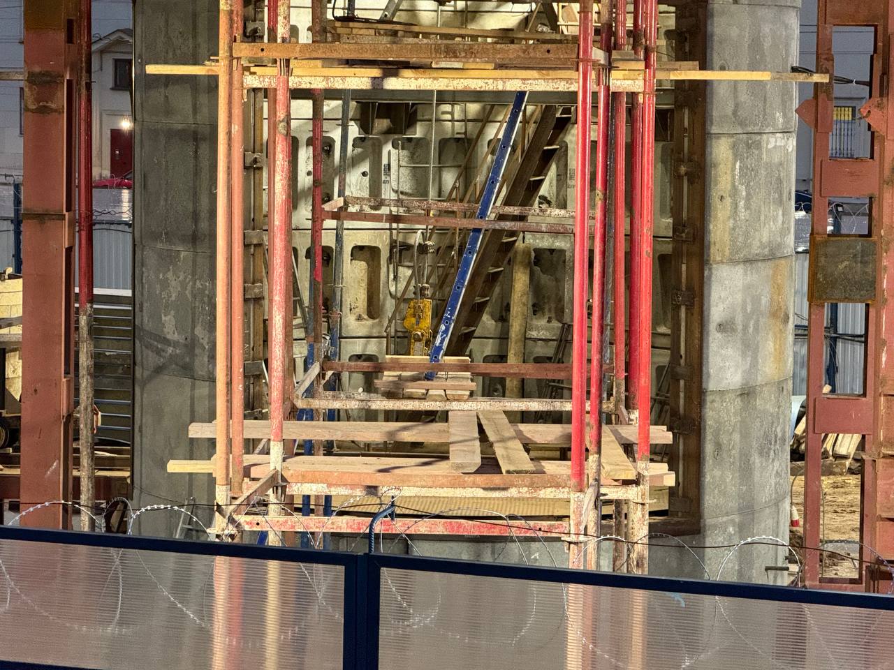 На строительстве вестибюля станции «Путиловская» Красносельско-Калининской линии Петербургского метрополитена продолжаются отделочные работы фасада вестибюля.