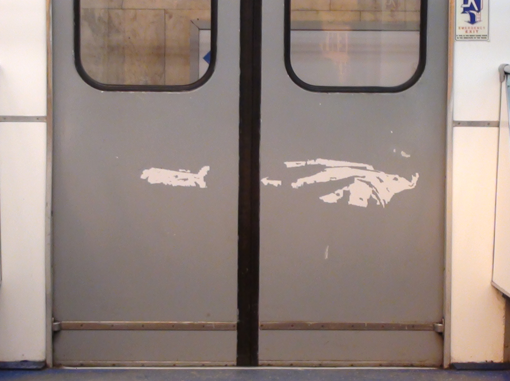 Писалось, что новые двери идут со специальным антивандальным покрытием, с которого краска, граффити, бумага и т.д. сдирается на раз. Но в депо почему-то решили на эти вандальные двери нанести свой слой серой краски, вот и результат.