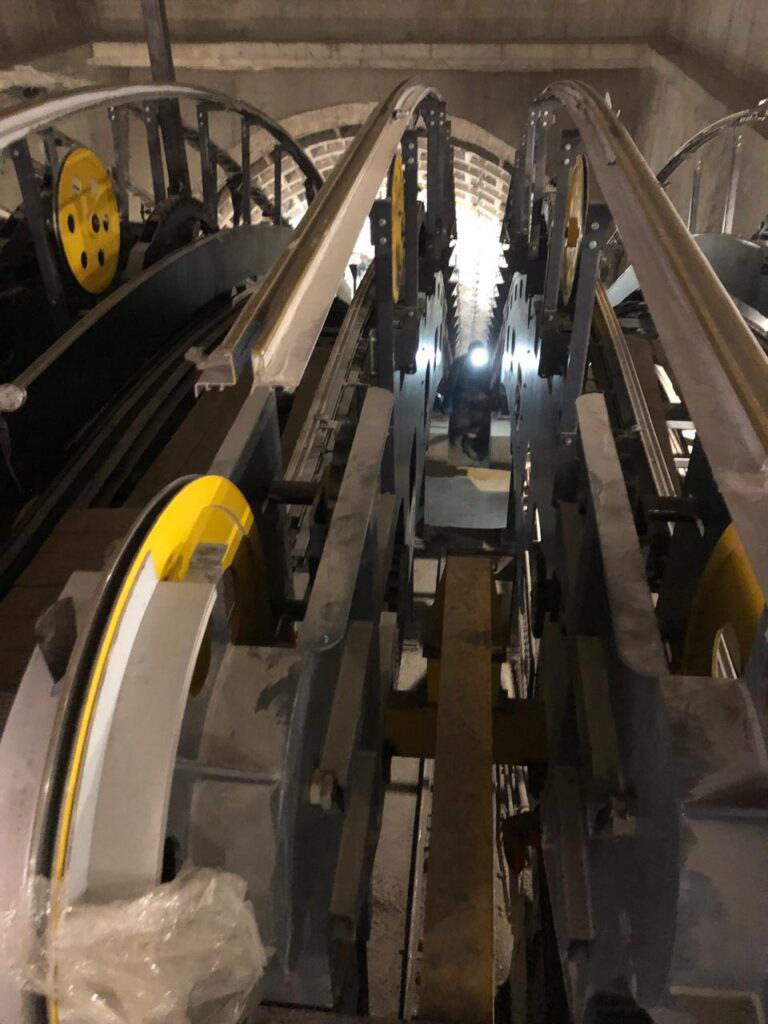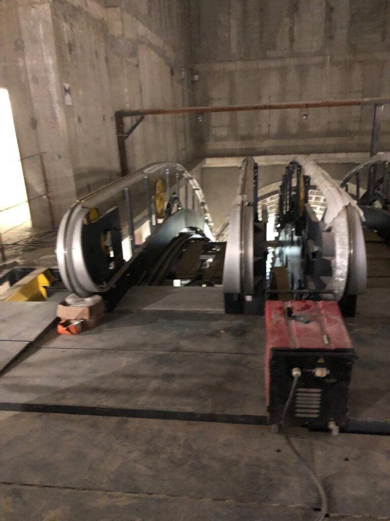Продолжается выверка зон эскалаторов на станции Путиловская перед навешиванием лестничного полотна.