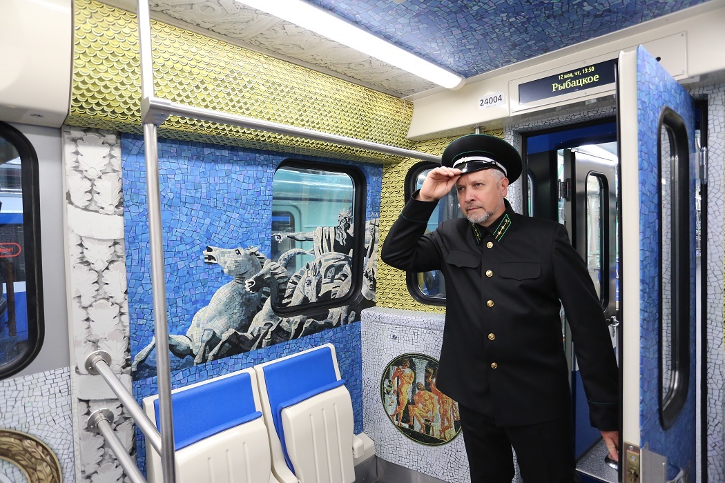 Гости стали первыми, кто смог оценить преимущества «Юбилейного» поезда, впервые вышедшего на линию с пассажирами. Особенность этого состава в том, что внутри его вагоны оформлены в тематике наиболее узнаваемых дворцов-символов Петербурга и его пригородов, а также демонстрируют богатство художественного убранства станций нашего метро.