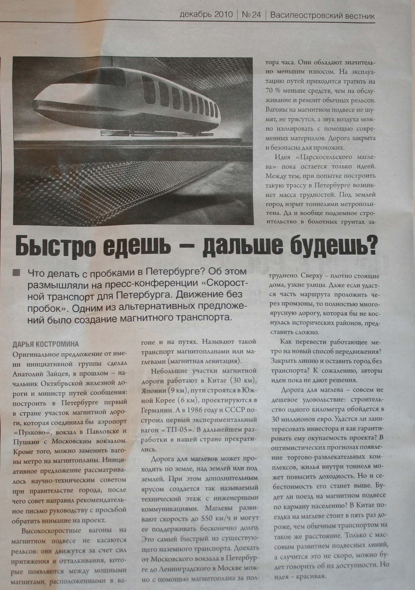К сожалению во всех этих статьях весь вопрос сводится к тому "где взять бабло?". Совершенно непонятно как этот поезд идёт по плану и профилю, как обеспечено питание, как обслуживается путь и подвижной состав, какие в конце концов там стрелки. Может в метро такие поезда были бы как раз - расстояния небольшие, пассажиропоток огромный, путь в тоннеле - защищён от осадков. Но вот нет конкретики. Хотя ясно, что это реальная действующая вещь - не какой-нибудь "СТЮ".