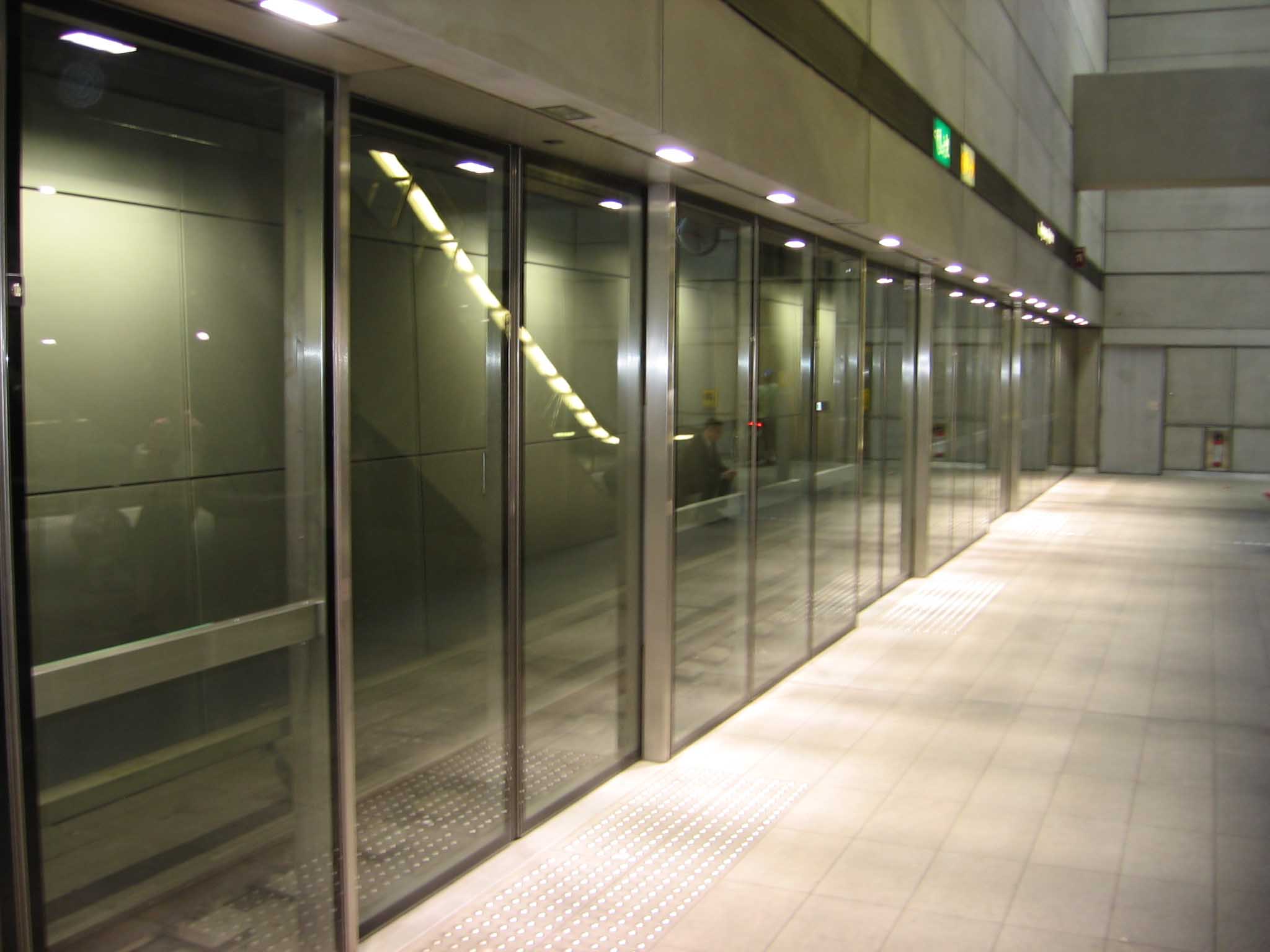Прибытие поезда. Этот уже с машинистом. Для открытия дверей надо нажать кнопку внутри вагона. Тамбуры отделены от основного салона прозрачными дверями, чтобы пройти через которые также необходимо нажать кнопку.