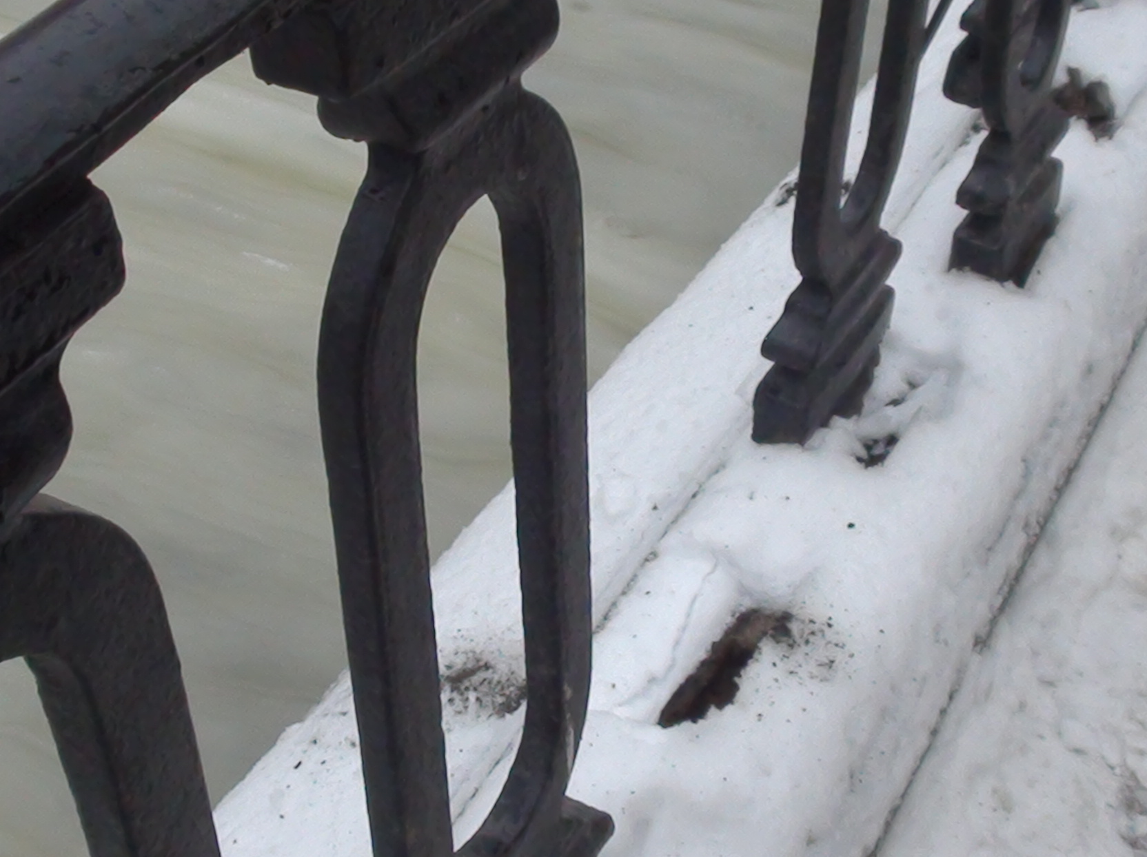 Сегодня проходя вдоль канала Грибоевдова утром, шёл вдоль ограды. Все металлические фрагменты ограды были на месте. Возвращаюсь парой часов позже, и вижу такую картину...Один из элементов отсутствует. Следы от свежевыдранного элемента. Видно, что он упал в канал. Моё предположение, что этот элемент могла задеть машина, которая врезалась в этот забор. Были следы толи от Газели, толи от какой-то подобной машины. Возможно мусоровоза японско-корейского производства.