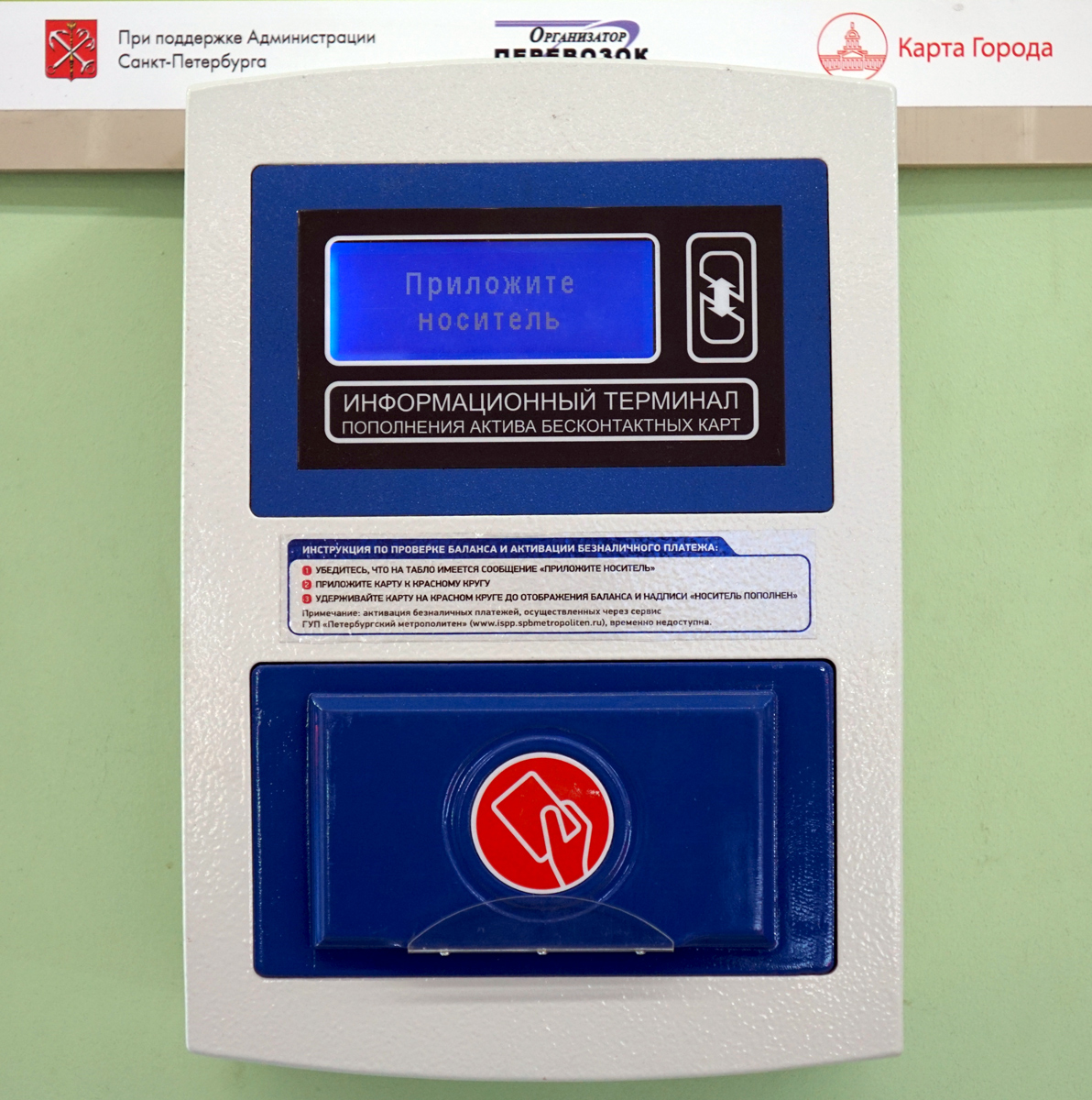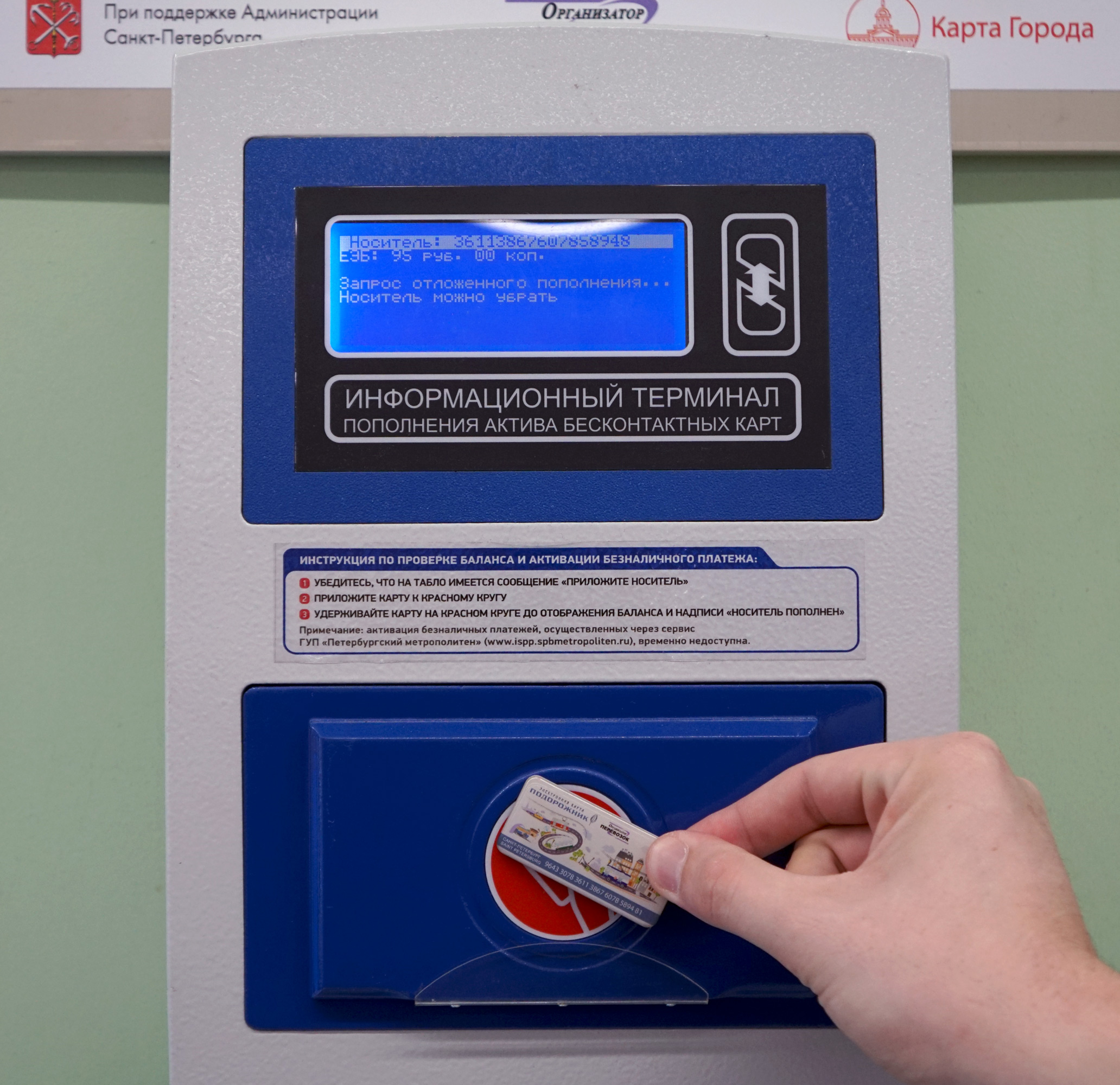 В СЛУЧАЕ УДАЛЕННОГО ПОПОЛНЕНИЯ, ЭЛЕКТРОННУЮ КАРТУ «ПОДОРОЖНИК» НЕОБХОДИМО АКТИВИРОВАТЬ ПРИКЛАДЫВАНИЕМ К ВИЗУАЛИЗАТОРУ НА СТАНЦИИ МЕТРОПОЛИТЕНА ИЛИ У КАССИРА, А ТАКЖЕ В СПЕЦИАЛИЗИРОВАННЫХ ТОЧКАХ ПРОДАЖ СПБ ГКУ «ОРГАНИЗАТОР ПЕРЕВОЗОК». ОБРАЩАЕМ ВАШЕ ВНИМАНИЕ НА ТО, ЧТО АКТИВАЦИЯ УДАЛЕННОГО ПОПОЛНЕНИЯ, СОВЕРШЕННОГО ЧЕРЕЗ СЕРВИС ГУП «ПЕТЕРБУРГСКИЙ МЕТРОПОЛИТЕН» (ISPP.SPBMETROPOLITEN.RU), ВРЕМЕННО ОСУЩЕСТВЛЯЕТСЯ ТОЛЬКО В ВИЗУАЛИЗАТОРАХ НА СТАНЦИИ МЕТРОПОЛИТЕНА ИЛИ У КАССИРА.