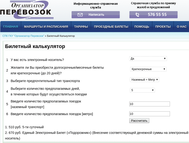 Калькулятор выбора оптимального проездного билета, сайт ОргП