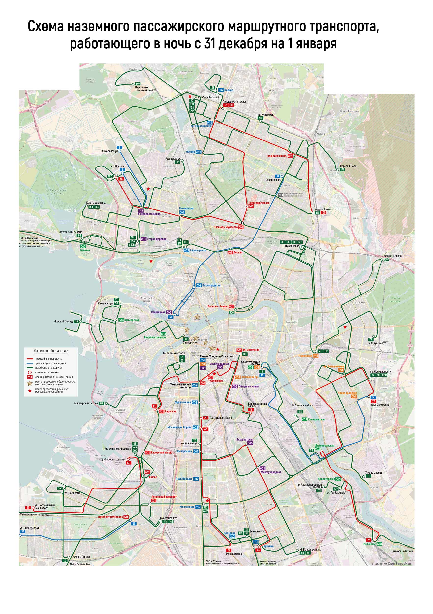 Для обеспечения подвоза пассажиров к станциям метрополитена и пересадочным узлам организовывается работа части городских маршрутов. Автобусы работают в новогоднюю ночь с интервалом движения 30 минут.