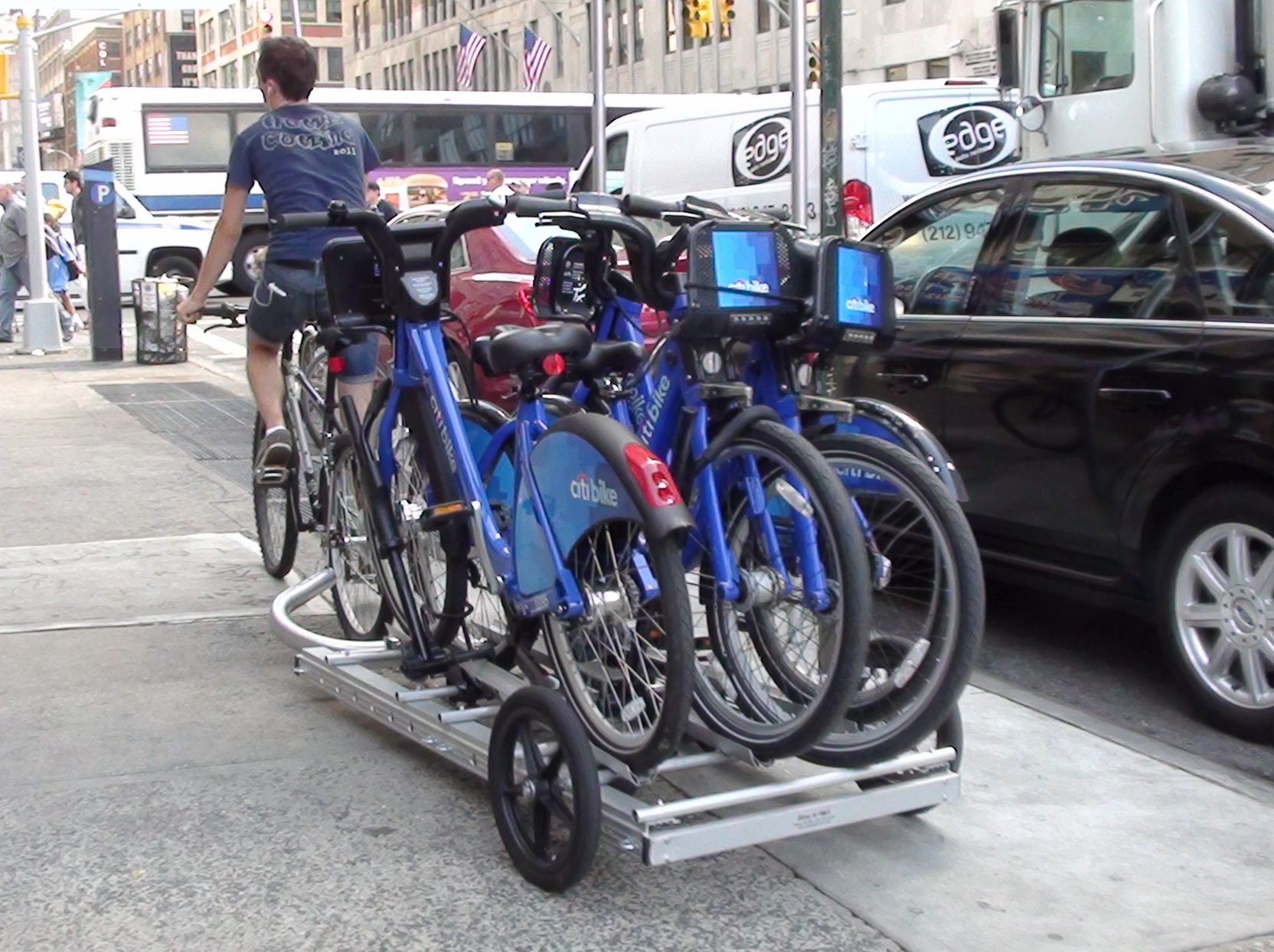 В Нью-Йорке было забавно увидеть доставщика велосипедов. Как известно, там есть несколько операторов аренды великов. Самый крупный — CitiBikes. Доставщик везёт на прицепе несколько великов в центр для распределения в наиболее загруженные парковки (там где больший спрос на них).