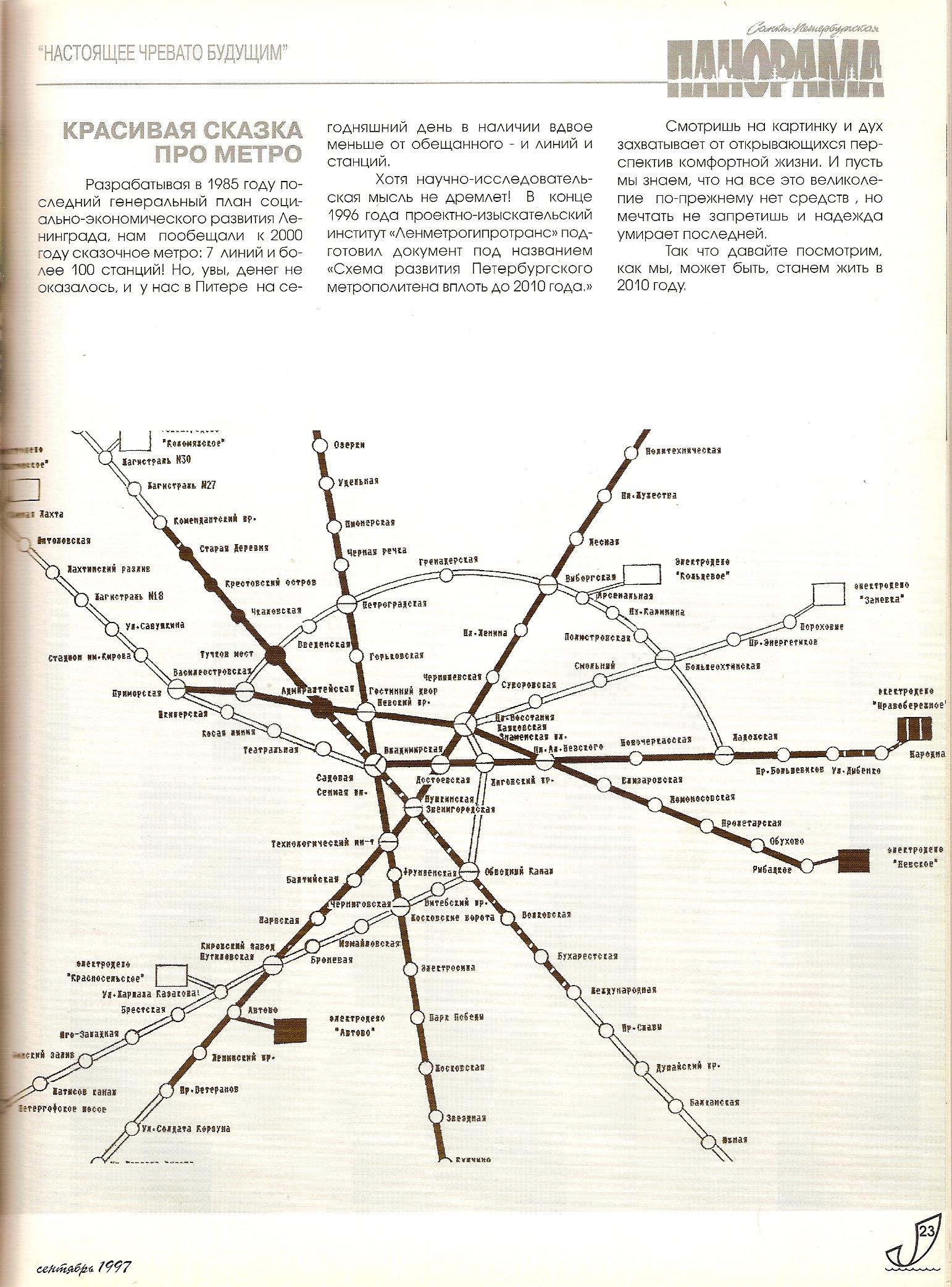 Две небольшие статьи из журнала "Санкт-Петербургская панорама" № 480, сентябрь 1997 года. Одна о проектах преодоления размыва, другая о плане развития метро до 2010 года :lol: К сожалению, схема в журнале в обрезанном виде.