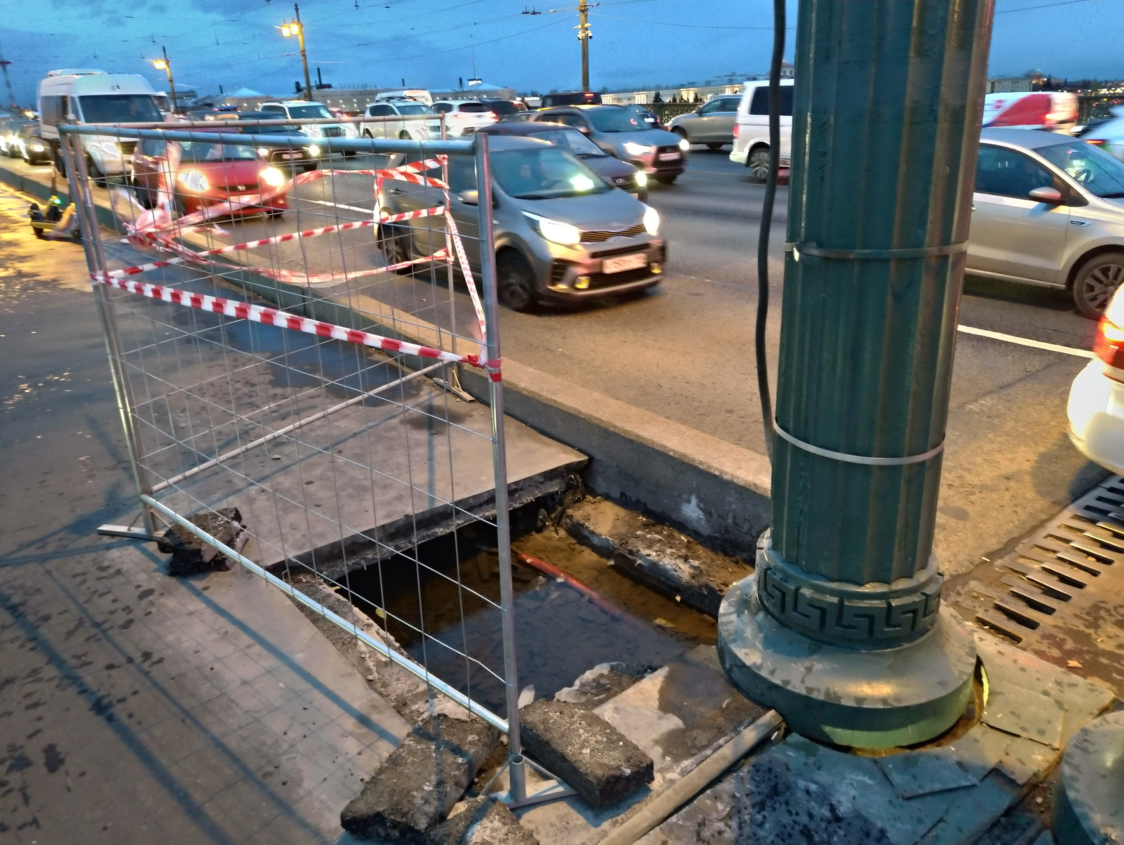 Недавно на Литейном мосту начали то ли ремонтировать освещение, то ли прокладывать ещё какие-то коммуникации, и по обе стороны около каждого столба освещения раскрыли небольшой квадратик покрытия пешеходной части.