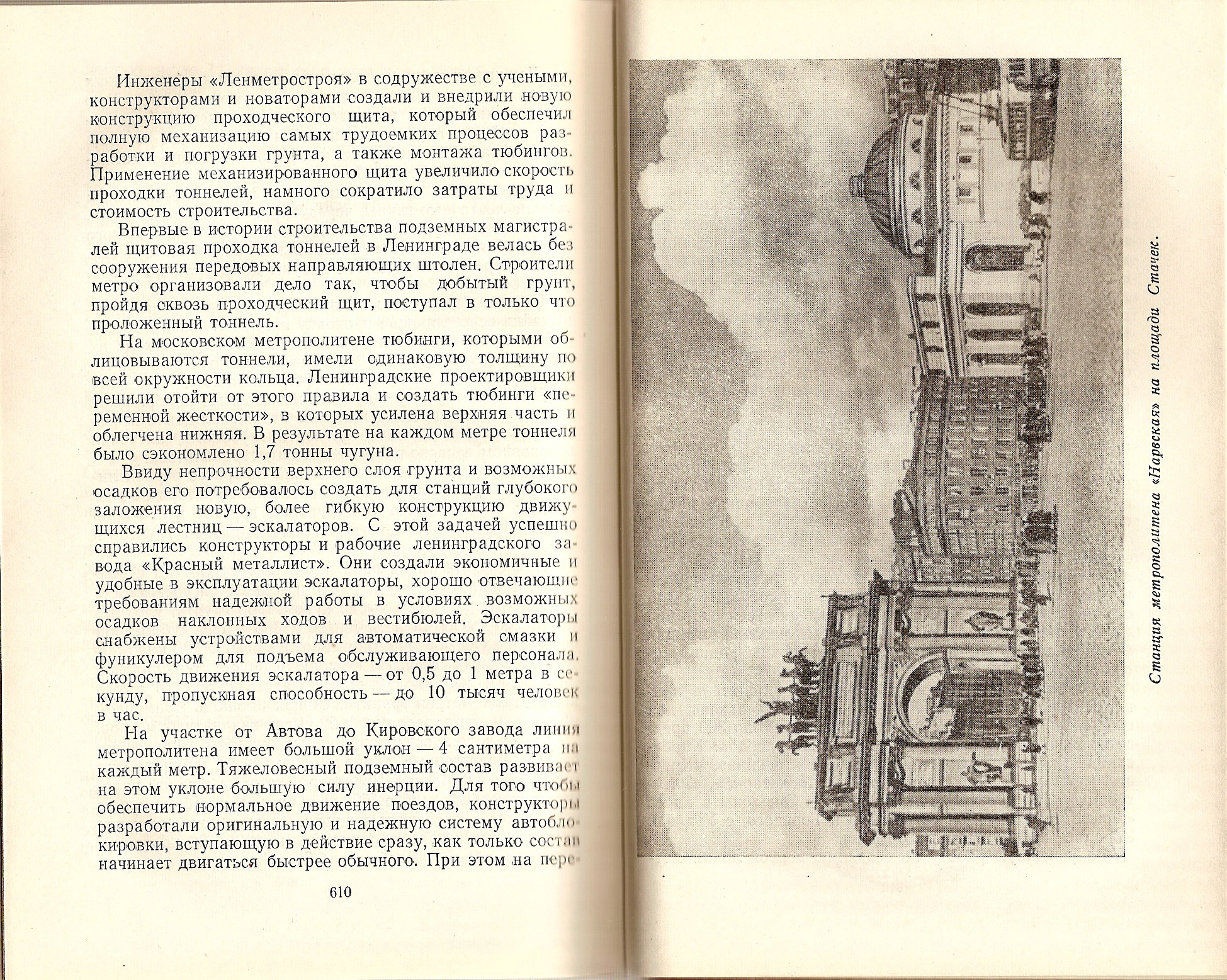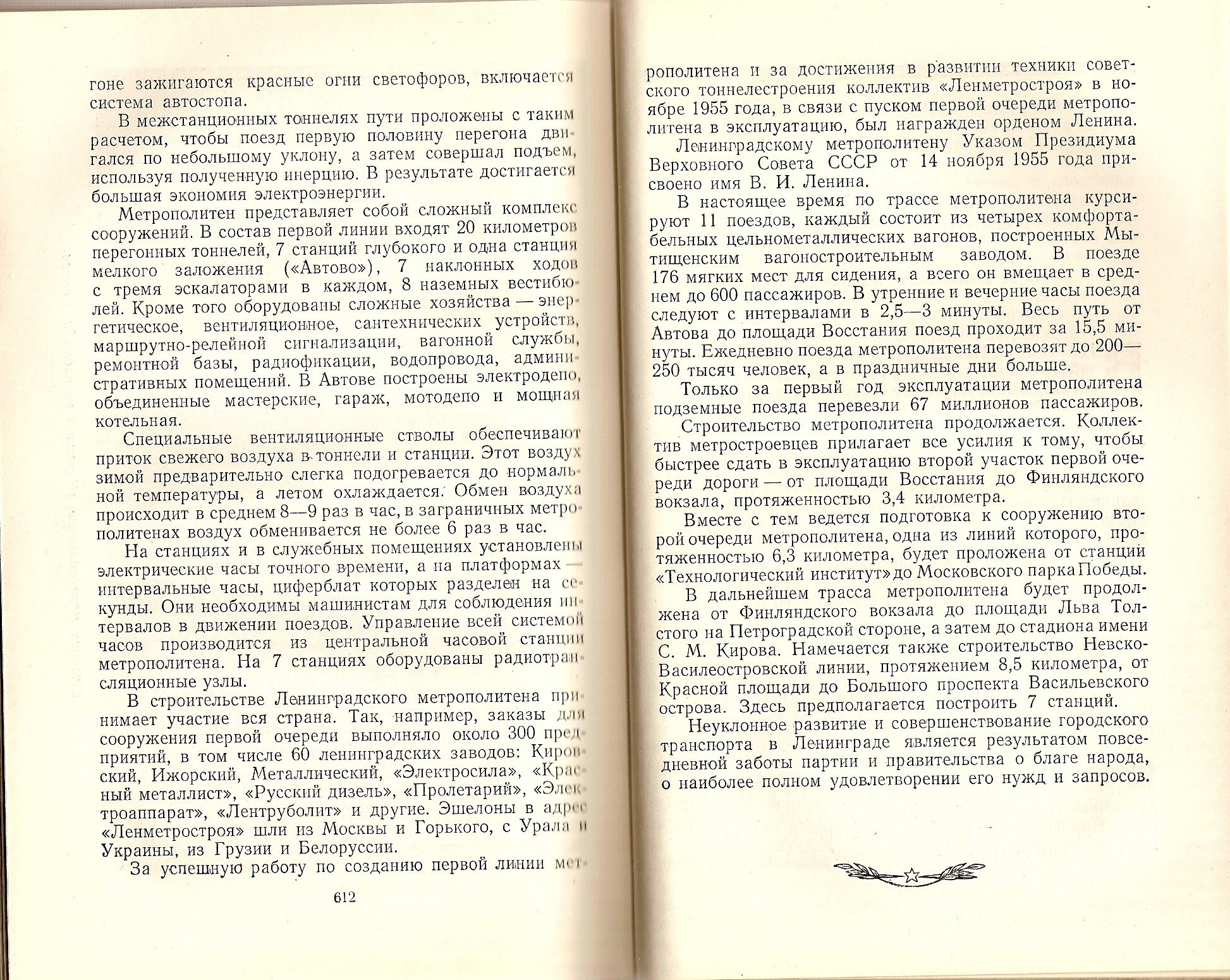 Сканы из книги "Город великого Ленина" (Л.: Лениздат, 1957г.), выпущенной к 250-летию города. Книга, по сути - сборник статей по истории города. О метрополитене сказано в двух статьях: "Строительство и архитектура города" (автор И.А. Бартенев) и "Городской транспорт" (авторы Б.А. Захаров, А.Ф. Иванов, А.И. Скачков). В первой статье приводится краткая информация об архитектурных проектах первых восьми станций, во второй - сведения о строительстве, перспективах развития, эксплуатационных характеристиках. Кстати, помнится, на форуме был вопрос "как обогревается метро?". В книге сказано, что в то время воздух зимой подогревался, а летом охлаждался.