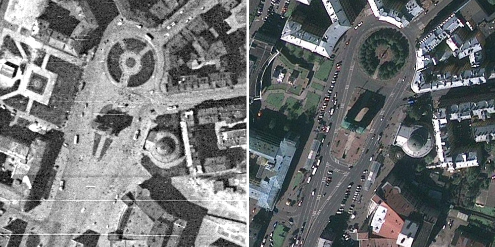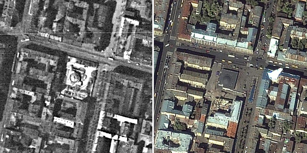 Заметно изменилась площадь Мира. Она лишилась храма, жилых домов, озеленения и названия; зато появились торговые павильоны, комплексы и автостоянки. Вместе с самой площадью поменяла название и станция метро, возле которой ещё не был убран забор.