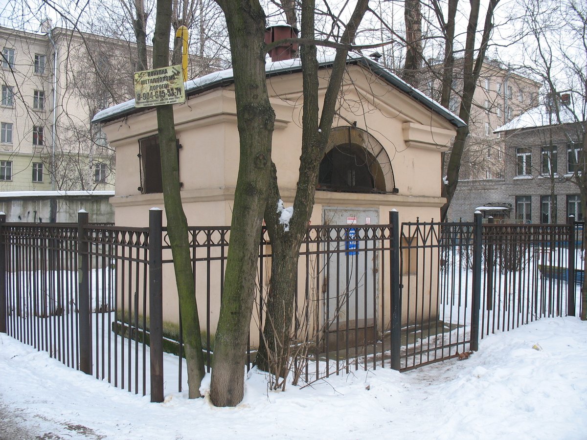 Поиск оптимальной конструкции длился некоторое время. Поэтому в жилых кварталах 1950-х годов постройки встречались и переходные варианты будок. Например, вот такая несерийная, оштукатуренная будка большого размера стоит в окрестностях Республиканской улицы, на Малой Охте: