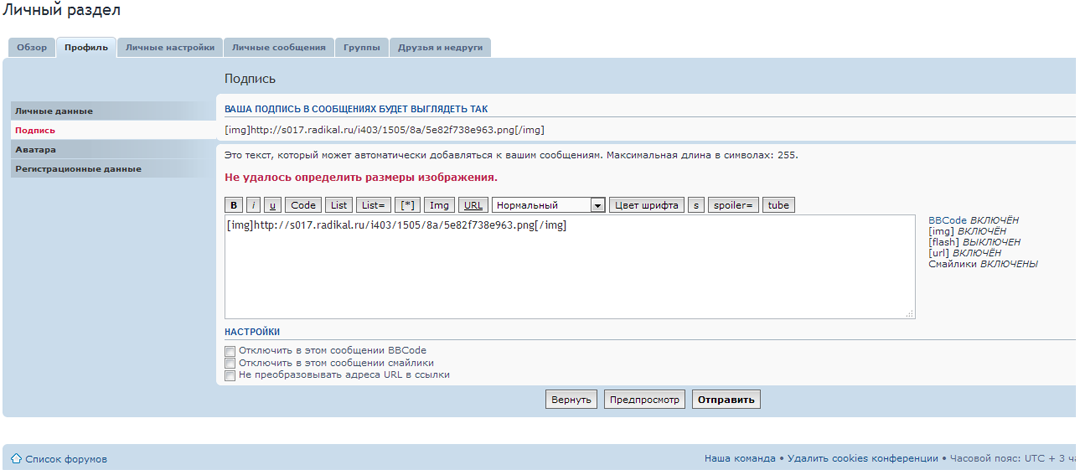 Пытаюсь поставить в подпись картинку http://s019.radikal.ru/i614/1505/99/b0d07d87e03b.png, ужимаю её всякими способами, но каждый раз получаю ошибку: Не удалось определить размеры изображения.