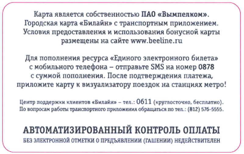 Городская карта «Билайн» содержит транспортное приложение «Подорожник» и позволяет оплачивать проезд на всех видах общественного транспорта Санкт-Петербурга. Владелец может оформить на них все действующие нельготные проездные билеты длительного пользования, а также использовать в виде единого электронного билета, предоставляющего право на совершение поездки в пределах фиксированной суммы.